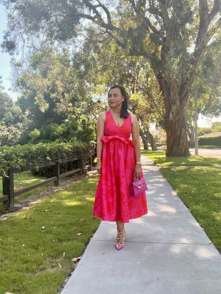 Vibrant and playful, this fuchsia midi dress radiates confidence. The jacquard texture adds depth and richness, while the bow accent gives it a touch of charm. Ideal for afternoon weddings or semi-formal celebrations, it’s chic yet effortlessly fun.