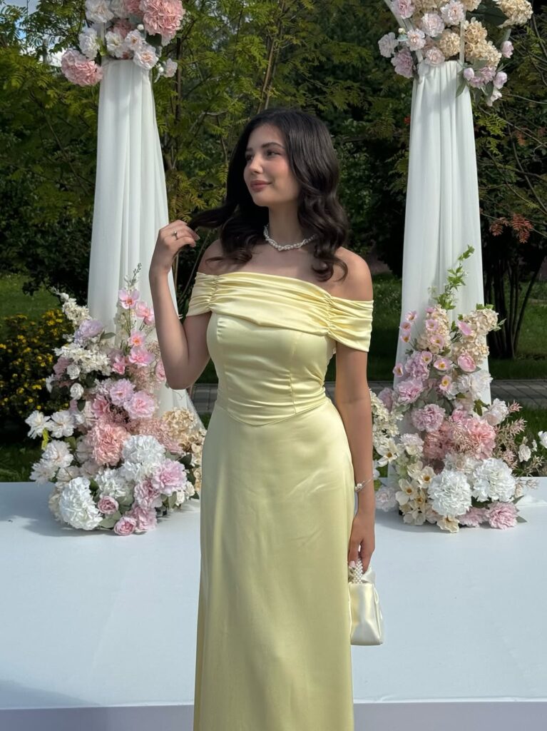 Soft and luxurious, this butter satin gown is all about refined femininity. The pearl embellishments add a touch of vintage glamour, while the off-shoulder neckline highlights the collarbones elegantly—perfect for sophisticated evening ceremonies.
