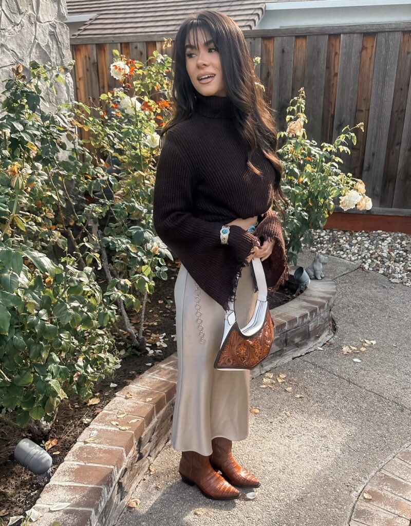 This outfit blends warmth, texture, and luxury. The chocolate knit turtleneck provides cozy comfort, while the satin midi skirt adds elegance and movement. Tooled leather accents tie the look back into Western heritage, creating a cohesive and thoughtfully styled outfit. This ensemble works beautifully for fall events, dinners, or stylish daytime outings. The mix of fabrics creates depth and modern Western refinement.