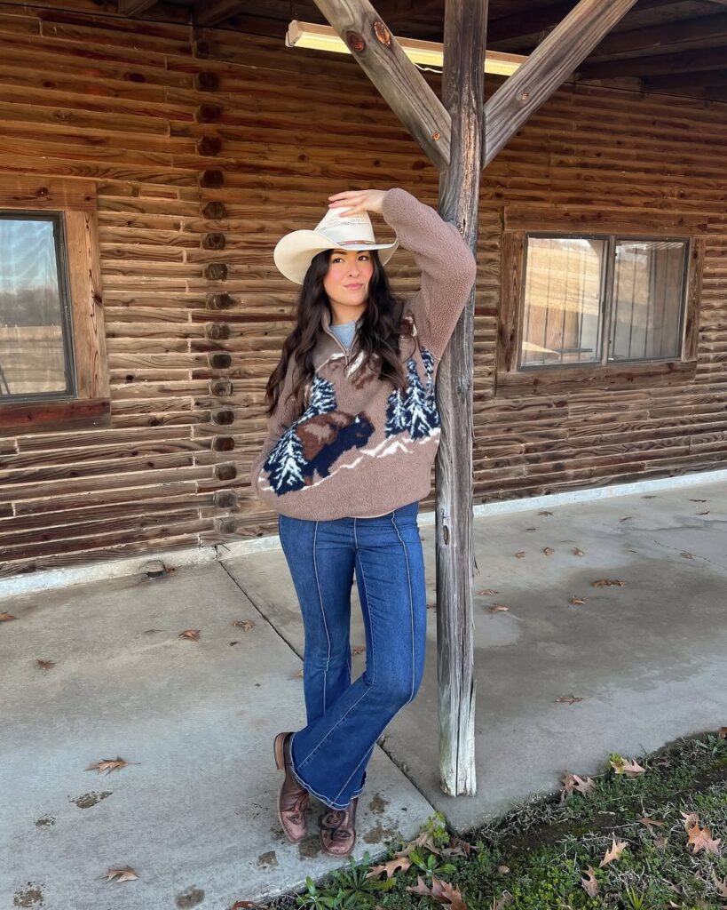 This look captures cozy Western charm with a buffalo fleece pullover paired with classic Western denim. The fleece adds warmth and softness, while the denim provides structure and timeless appeal. It’s a go-to outfit for chilly days, outdoor adventures, or relaxed weekends. The combination offers exceptional comfort without sacrificing style, making it a reliable Western option for everyday wear.