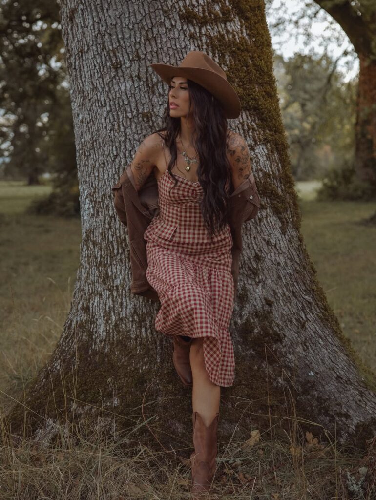A gingham slip dress offers effortless charm, and when paired with suede Western boots, the look transforms into a refined Western ensemble. The softness of the slip dress contrasts beautifully with the rugged texture of suede, creating a balanced and stylish outfit. This look works well for sunny days, picnics, or casual outdoor gatherings. It’s comfortable, lightweight, and easy to move in—an ideal mix of country sweetness and Western sophistication.