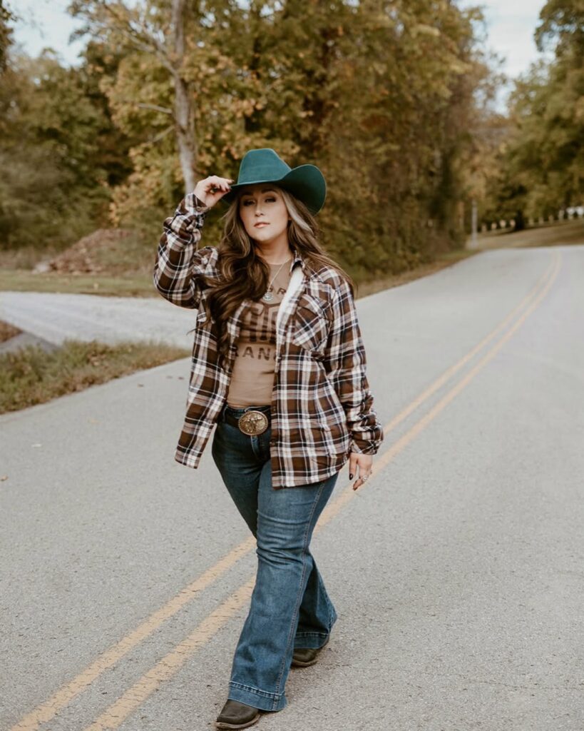 A plaid Western jacket instantly delivers that iconic Western look, especially when paired with flared denim that elongates the legs and adds a retro vibe. This outfit is ideal for transitional seasons, casual weekend outings, and days when you want an effortless Western statement. The plaid adds energy and personality, while the flared jeans create a timeless silhouette. Together, they form a comfortable yet stylish ensemble that channels both old-school Western and modern street-style ease.