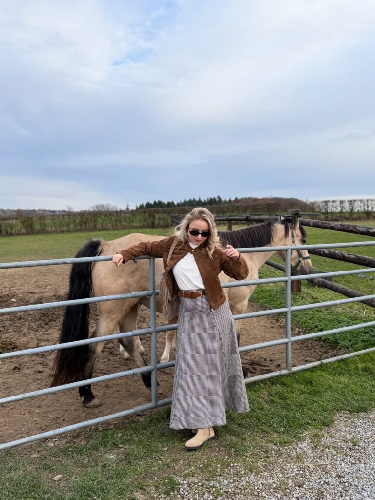 This ensemble blends traditional Western elements with high-fashion elegance. The suede fringe jacket brings texture and Western authenticity, while the houndstooth maxi skirt adds refinement and sophistication. Together, they create a powerful yet graceful look suitable for stylish events, museum visits, or elevated daytime outings. The outfit balances comfort through its breathable fabrics and trendiness through its contrasting patterns and textures.