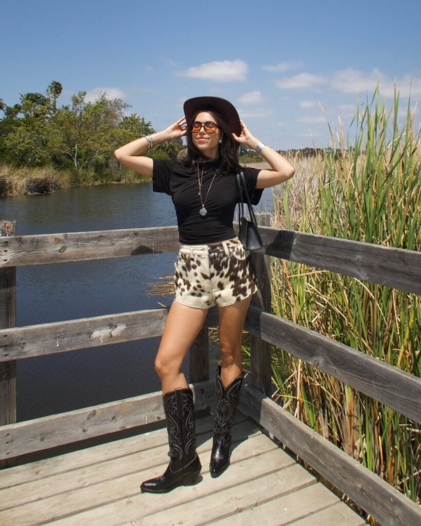 Cowhide print shorts give an instant Western edge, especially when balanced with a simple classic black tee. This combination keeps the print as the focal point while maintaining a clean, modern silhouette. It’s perfect for casual summer days, country concerts, or playful weekend outings. The outfit blends comfort with statement-making style, offering a trend-driven Western look without overwhelming details. With lightweight fabrics and relaxed structure, this ensemble exudes ease and confidence.