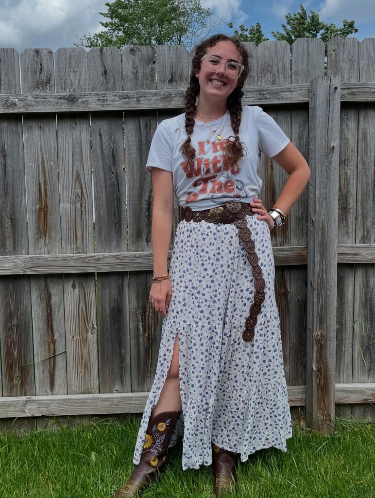 This pairing brings a youthful, expressive take to Western styling. A graphic tee adds personality and a touch of casual coolness, while the floral split maxi skirt enhances the look with movement and romantic Western flair. The high slit introduces a fashion-forward element, making the outfit suitable for daytime activities, music festivals, or coffee dates. The blend of casual and feminine elements makes the look comfortable, trendy, and perfect for warm, breezy days.