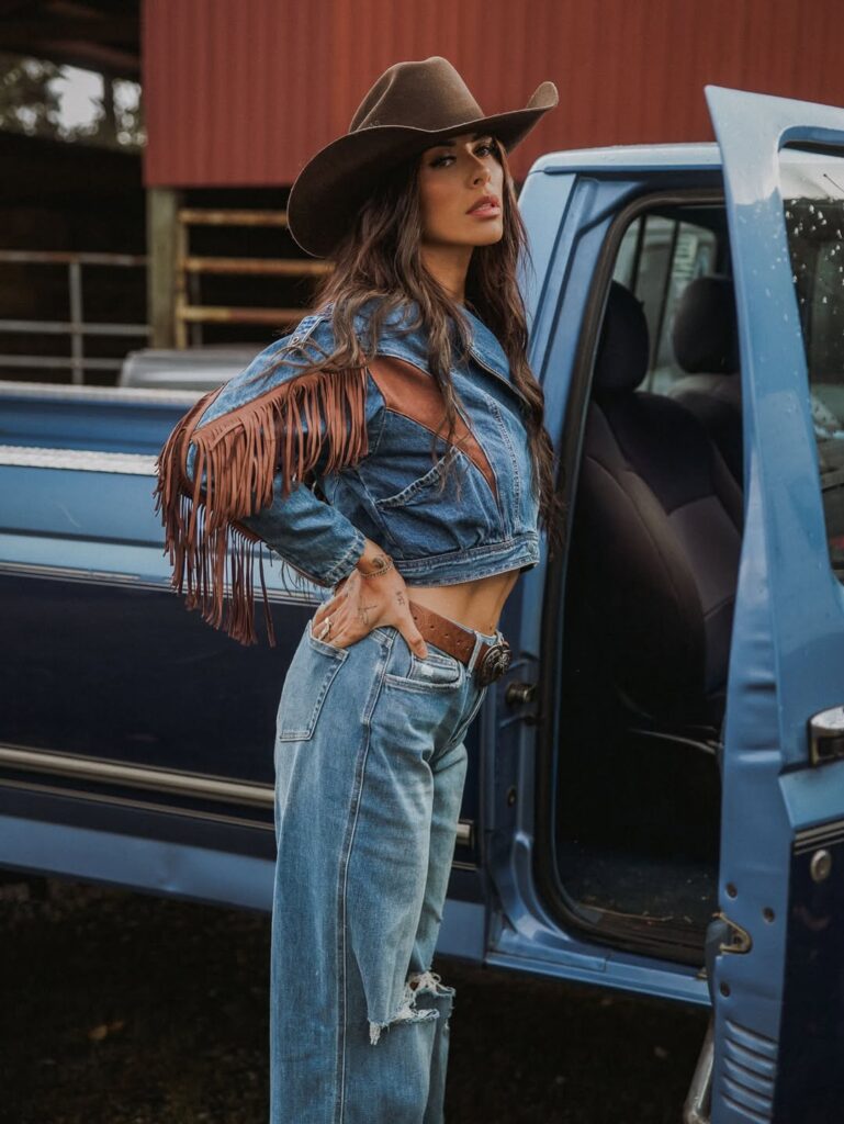 Fringe instantly amplifies any Western outfit, and a fringed denim jacket paired with wide-leg Western jeans creates a bold, confident look. The combination offers movement, volume, and classic Western attitude. Perfect for festivals, concerts, or stylish casual outings, this outfit blends comfort with standout appeal. The wide-leg silhouette ensures ease of movement while keeping the look modern and fashion-forward.