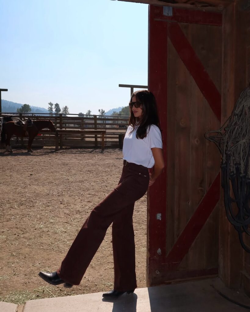 A crisp white tee paired with chocolate ranch denim offers a clean, classic Western look. The simplicity of the tee balances the richness of the denim, while black Western boots add sharpness and structure. This outfit is ideal for everyday wear, casual activities, or quick outings where you want something effortless yet stylish. The comfort of the fabrics and the timeless elements make this a reliable Western go-to.