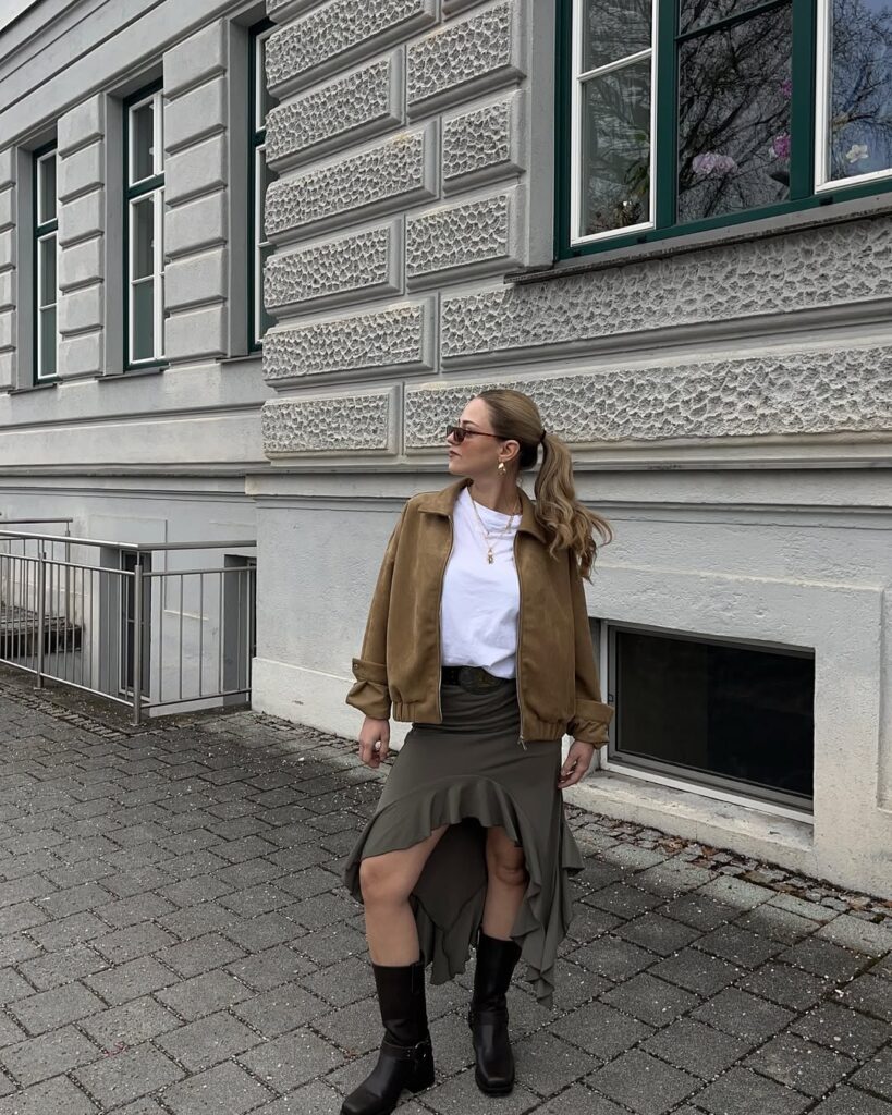 A suede bomber jacket brings modern Western ruggedness, and when paired with an asymmetric ruffled skirt, the result is a unique mix of strength and softness. This outfit stands out for its dynamic silhouette, making it great for art events, stylish day outings, or occasions where you want a fashion-forward Western look. The jacket adds warmth and edge, while the skirt introduces movement and elegance, creating a beautifully balanced ensemble.