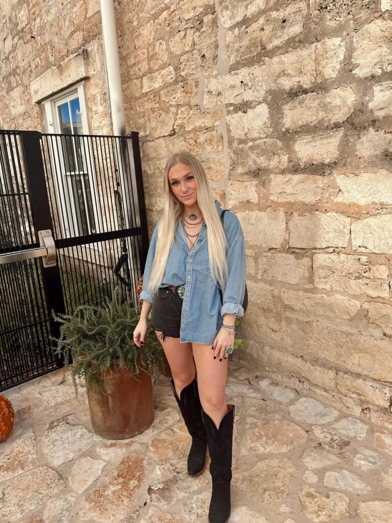 A relaxed denim shirt paired with black cutoff shorts is an effortlessly cool take on Western casualwear. The looseness of the shirt offers all-day comfort, while the structured shorts keep the outfit modern and streamlined. This look shines in warm weather, outdoor activities, or casual weekends when you want something easy yet stylish. Its laid-back energy pairs well with Western accessories, boots, or hats, making it versatile enough for anything from concerts to road trips.
