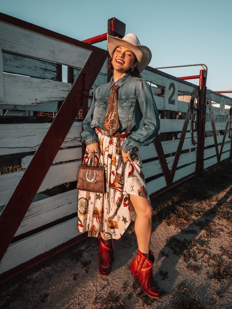 Combining a denim Western shirt with a printed rodeo skirt creates a striking balance of structure and playful pattern. The denim shirt anchors the look with classic Western attitude, while the rodeo skirt adds movement, color, and visual interest. This outfit works beautifully for festivals, daytime events, and casual hangouts. It blends tradition with modern flair, offering comfort through its breathable fabrics and trendiness through its mix-and-match styling. The result is a fun, expressive look that feels confidently Western.