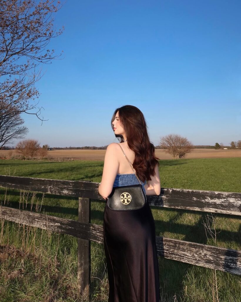 This outfit strikes a beautiful balance between softness and drama. The satin midnight skirt creates a fluid, elegant silhouette, while the smocked blue top adds a touch of texture and structure. This combination works perfectly for evening gatherings, outdoor events, or stylish dinners where you want a hint of Western charm without going fully rustic. The comfort of the smocked design pairs effortlessly with the lightweight drape of satin, making this ensemble both trendy and easy to wear. Its polished yet relaxed feel embodies a modern Western aesthetic.