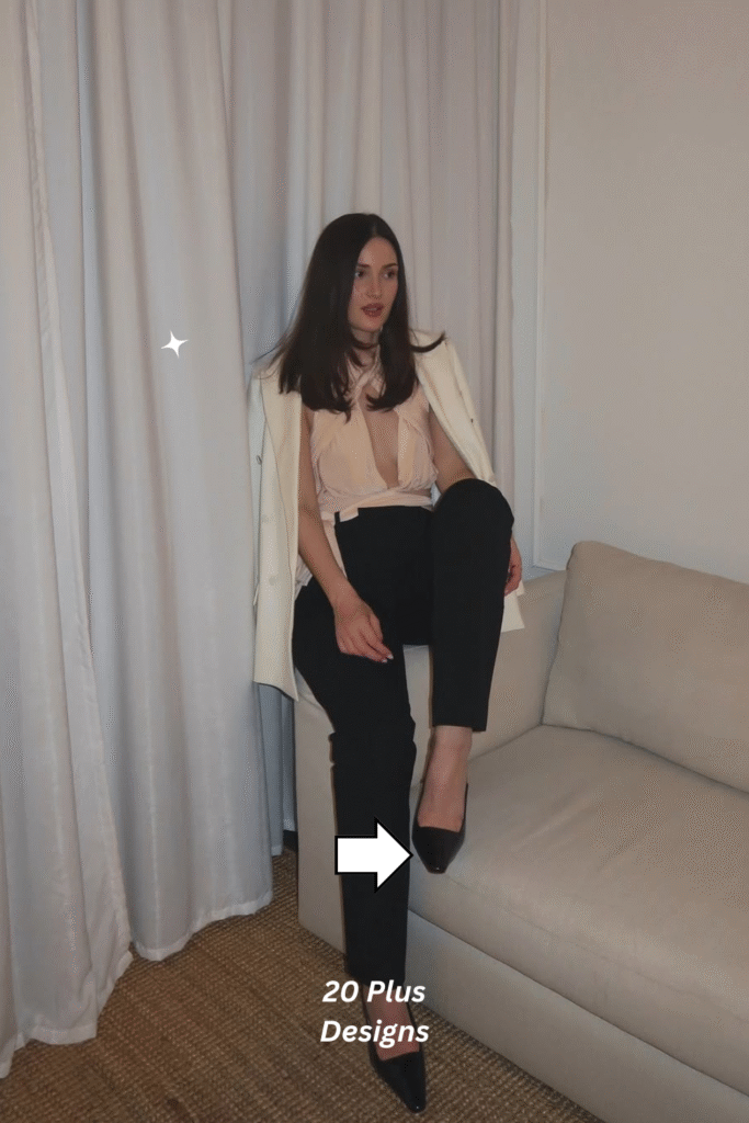11. Blush Chiffon Draped Top with Black Trousers, Cream Blazer & Black Heels