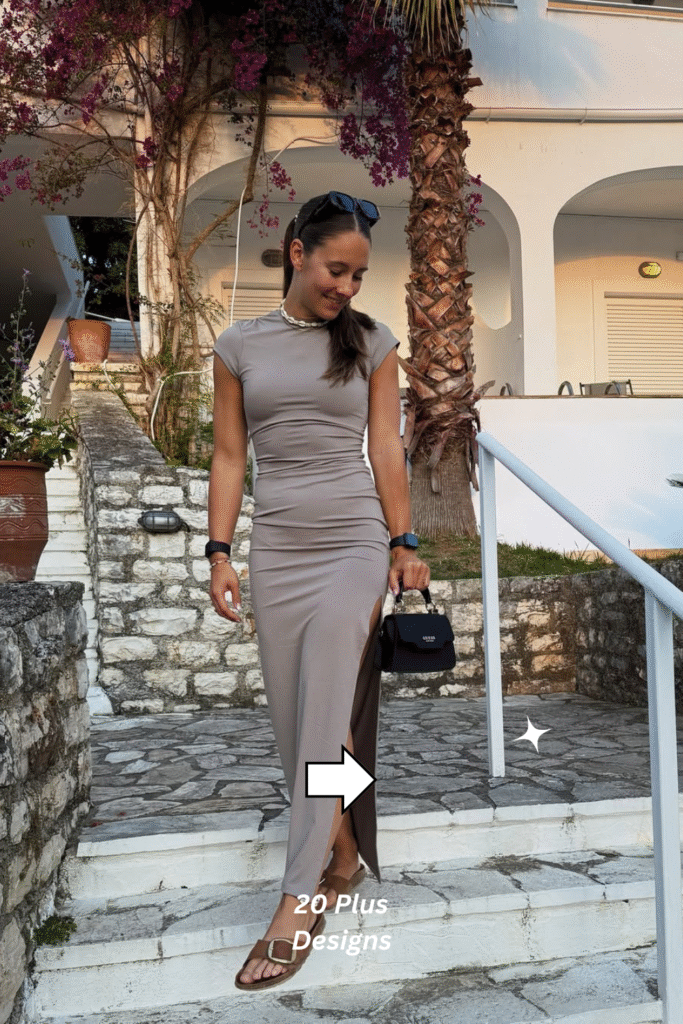13. Taupe Bodycon Maxi Dress with Side Slit and Minimal Sandals