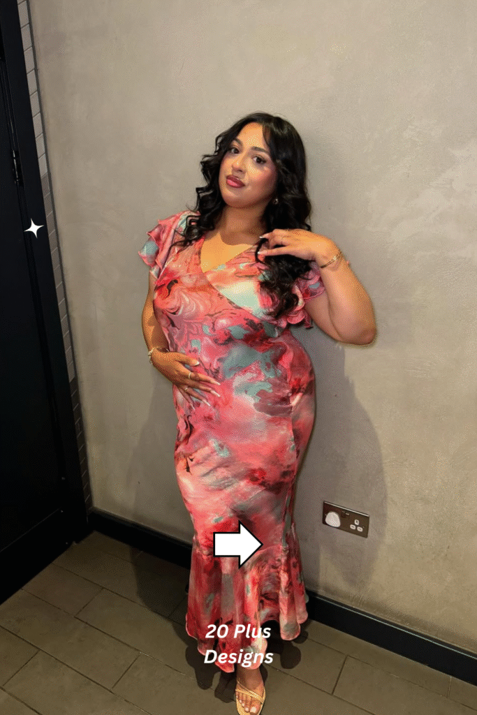 Softly draped and luxuriously fluid, this satin gown creates a dreamy dinner look. The coral marble tones bring warmth, and the flutter sleeves add romance. Perfect for evenings that feel a little more magical.
