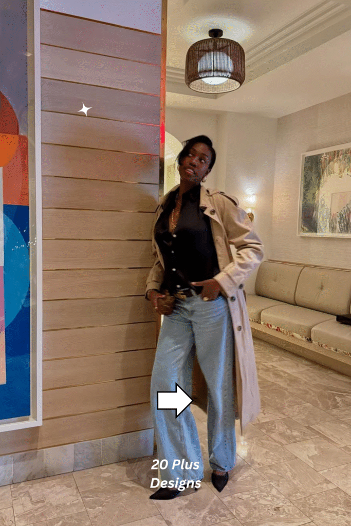 Relaxed yet polished, this outfit is ideal for casual winter dinners. The black shirt grounds the look, the denim adds approachability, and the trench coat ties everything together with timeless style.