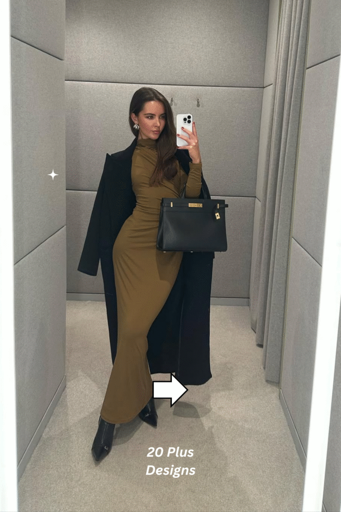 This ensemble merges sleek style with timeless allure. The olive hue flatters winter tones, while the bodycon silhouette offers a modern, confident edge. Layered with a structured black coat, it becomes an instant statement for dinner dates or elegant night outings.