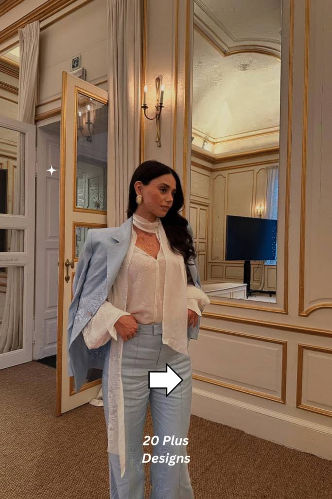 The soft blue tone introduces freshness into winter fashion, while the structured tailoring keeps things sleek. A sheer silk blouse underneath adds depth and delicacy. It’s a sophisticated look that moves seamlessly from formal dinners to after-hours gatherings.