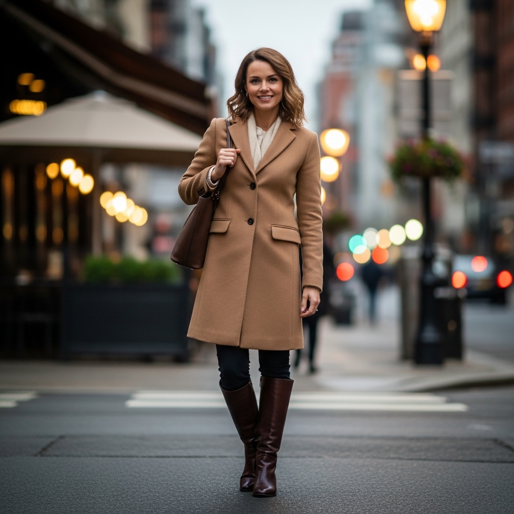 A camel coat is a timeless winter staple that never goes out of style. Pair it with skinny jeans, a neutral turtleneck, and knee-high boots for a polished look. Add gold jewelry and a structured bag to elevate your outfit. This chic combo is perfect for city strolls or casual coffee dates while keeping you warm and elegant.