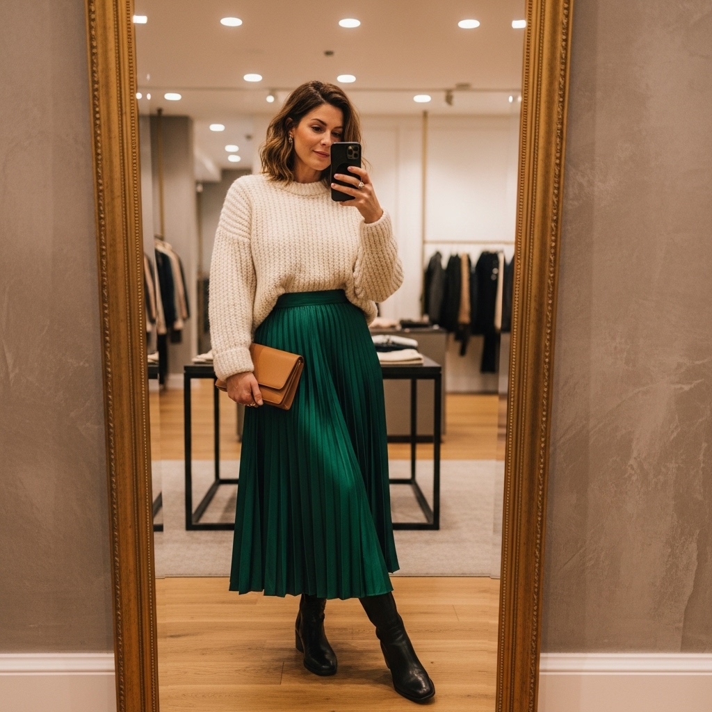 Mix cozy and classy with a chunky knit sweater tucked into a pleated or satin midi skirt. Add ankle boots for a feminine touch. This look offers warmth while maintaining flowy elegance — ideal for office wear or winter brunches. Balance proportions by slightly tucking in the sweater’s front for a flattering silhouette.