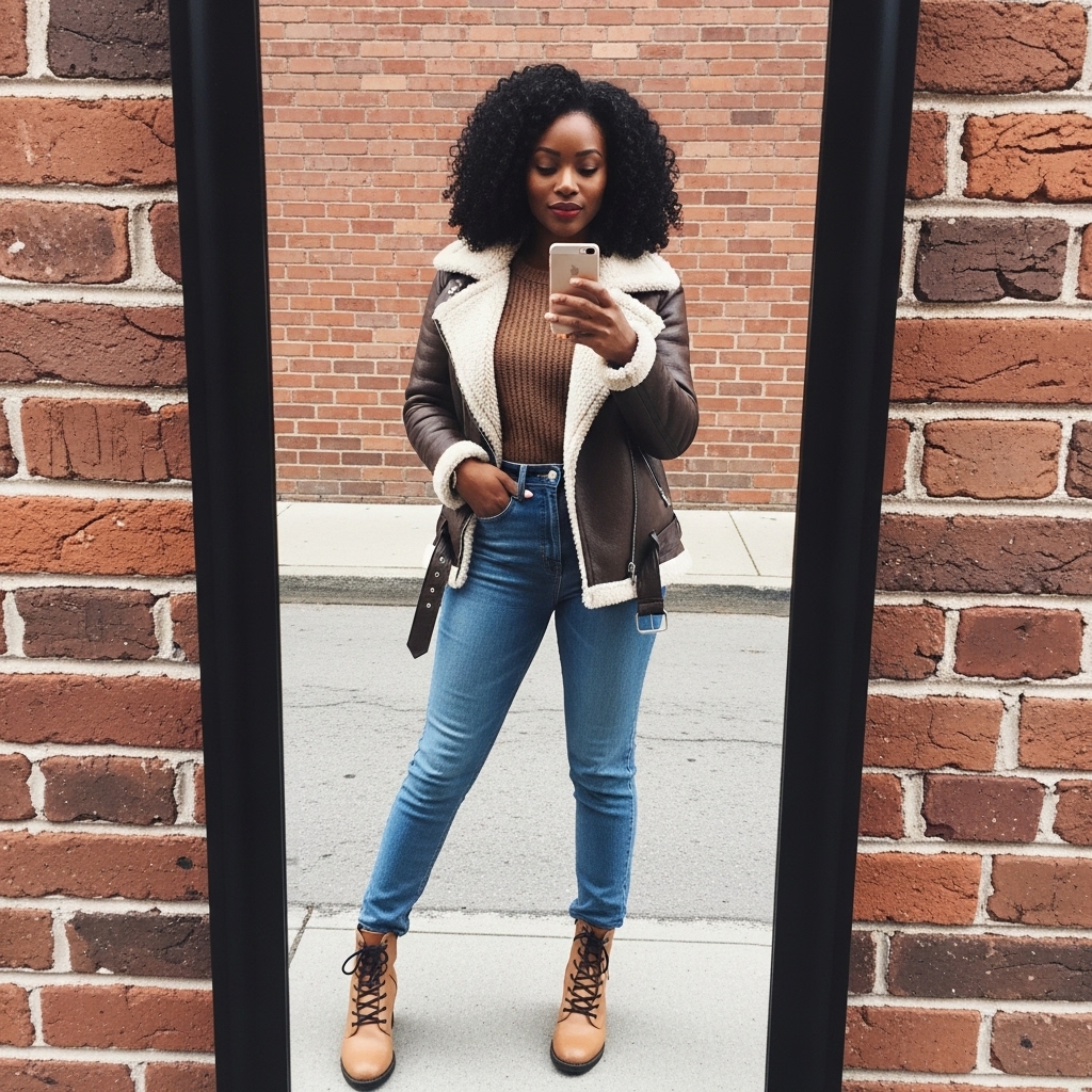 A shearling-lined jacket brings warmth and texture to simple denim outfits. Pair it with a fitted knit top and high-waisted jeans. Finish with lace-up boots for a casual yet polished look. This outfit strikes the perfect balance between rugged and refined — ideal for winter adventures.