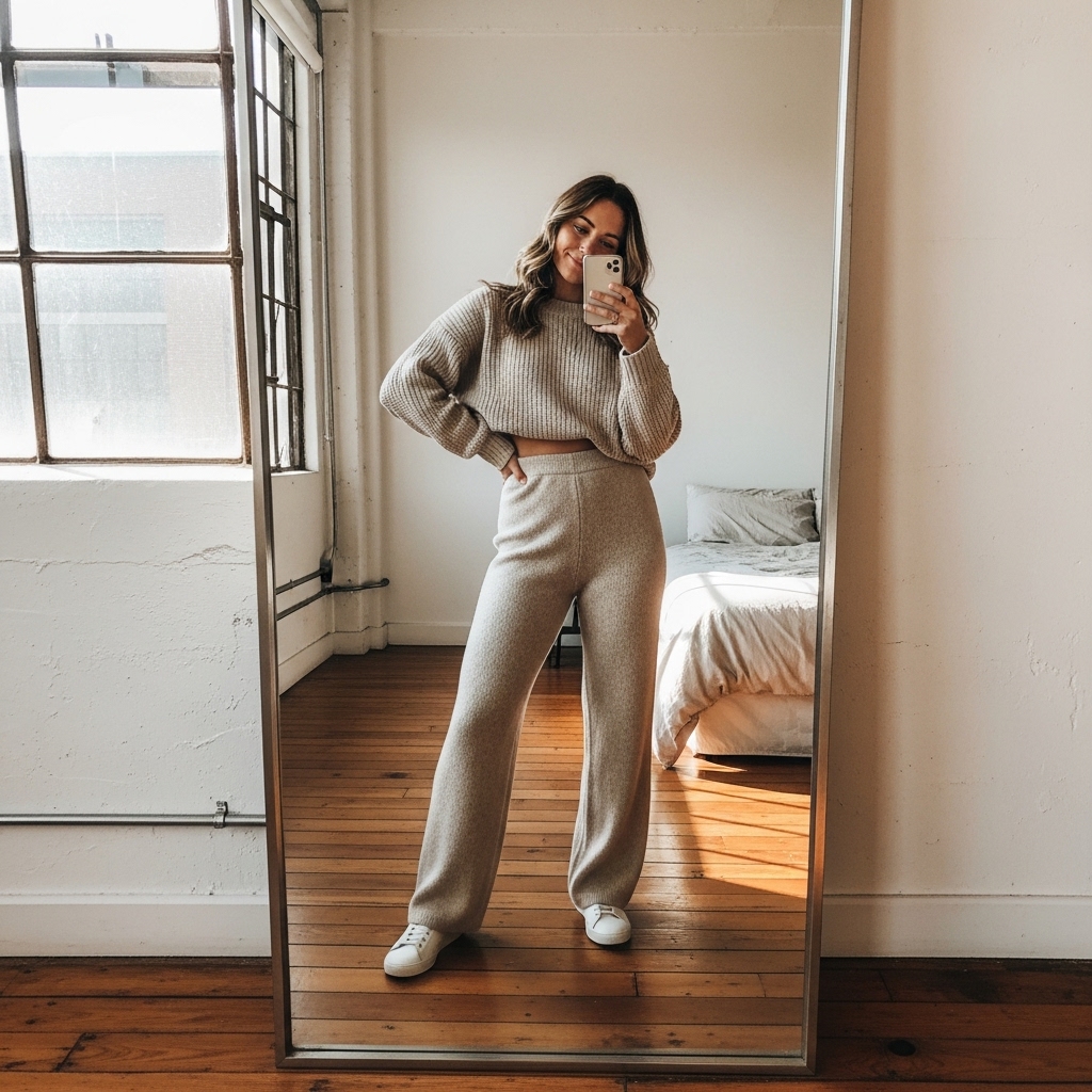 A matching knit co-ord set is the epitome of comfort meets chic. Choose a neutral color for a minimalist vibe or a bold hue for personality. Add sneakers or boots depending on the occasion. This outfit is perfect for travel days, casual brunches, or lounging in style during cold weather.
