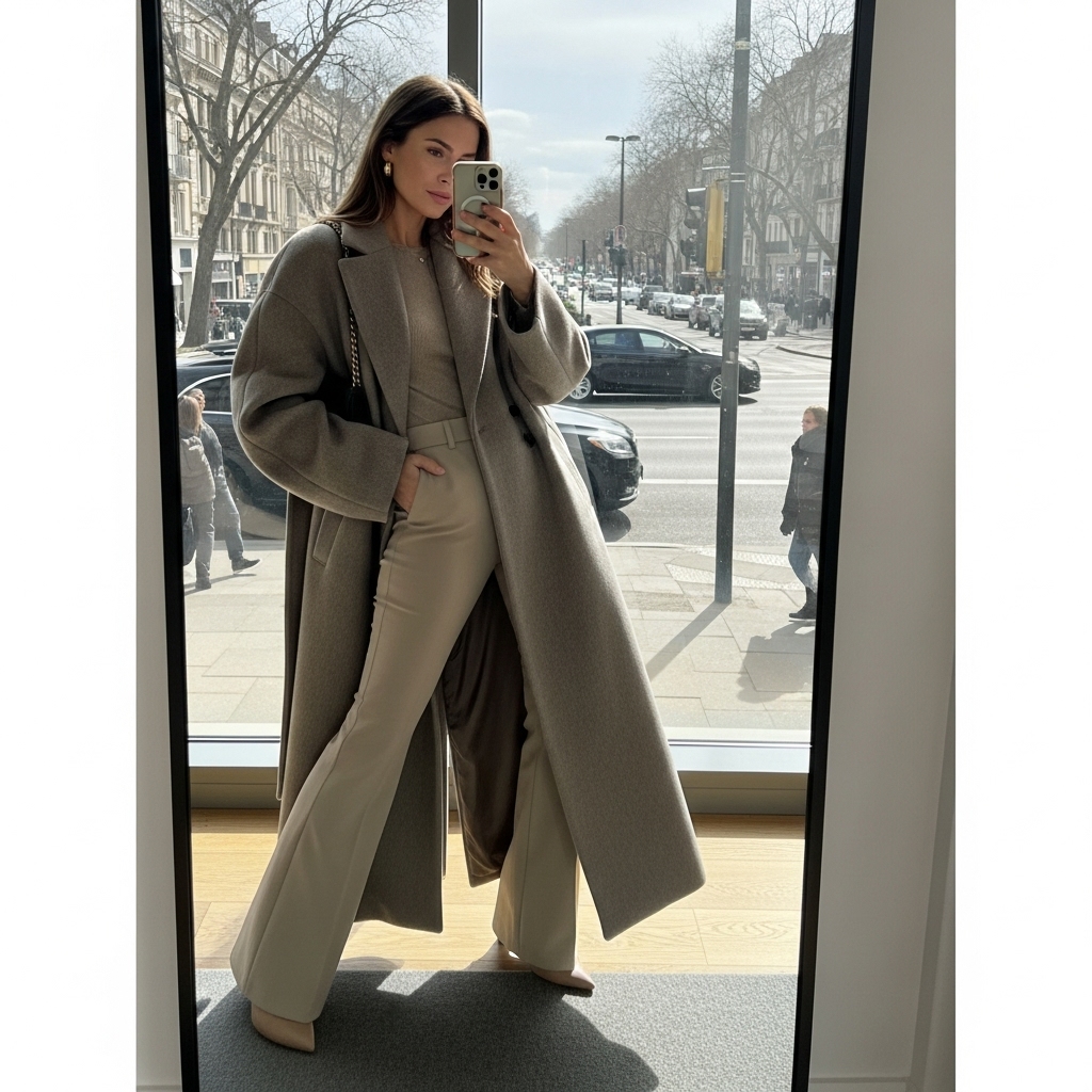 For a sleek and elongating look, pair a maxi-length wool coat with flared pants. Add a fitted top underneath and heeled boots to elevate the silhouette. Choose neutral tones for a minimalist approach or jewel tones for extra drama. This sophisticated outfit is perfect for city winters and night outings.