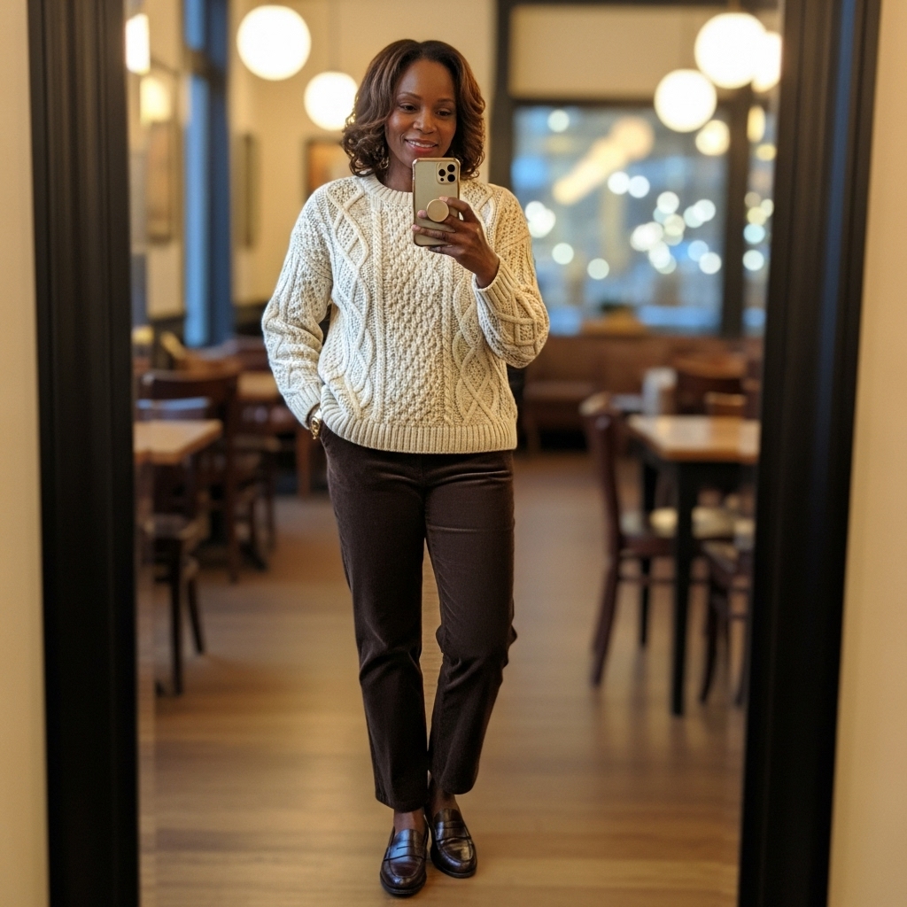Combine texture and warmth with a cable-knit sweater and corduroy pants. Add loafers or ankle boots for a preppy winter vibe. This cozy outfit feels nostalgic yet modern — perfect for study sessions, coffee dates, or just enjoying a crisp winter day in comfort and style.