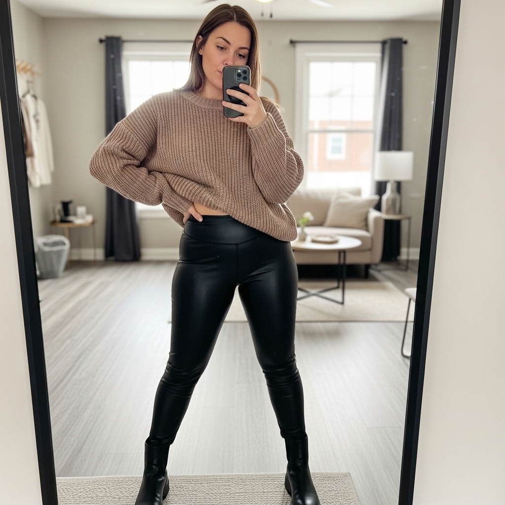 For the ultimate cozy-yet-edgy winter look, style an oversized knit sweater with black leather leggings. Add chunky boots and a beanie for a streetwear vibe. This outfit balances softness and attitude — ideal for everyday errands or weekend outings. Finish with minimal makeup and statement sunglasses for a sleek finish.