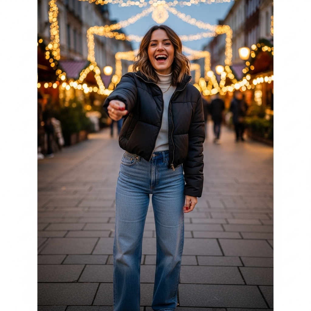 Stay trendy and warm with a cropped puffer jacket paired with high-waisted wide-leg jeans. Add a fitted turtleneck underneath to balance the volume. Complete the look with chunky sneakers or ankle boots. This combo offers the perfect mix of comfort and modern style — a go-to for casual winter days.