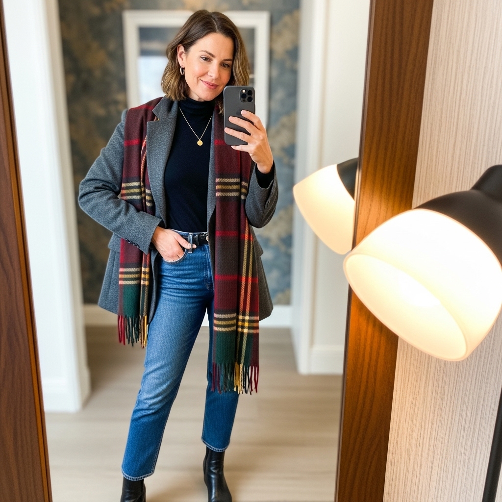 A wool blazer instantly elevates any outfit, making it winter-ready with a touch of sophistication. Layer it over a turtleneck and straight-leg jeans. Add a plaid scarf and ankle boots for extra warmth and charm. Perfect for workdays or dinner dates, this look proves structure and comfort can coexist beautifully.