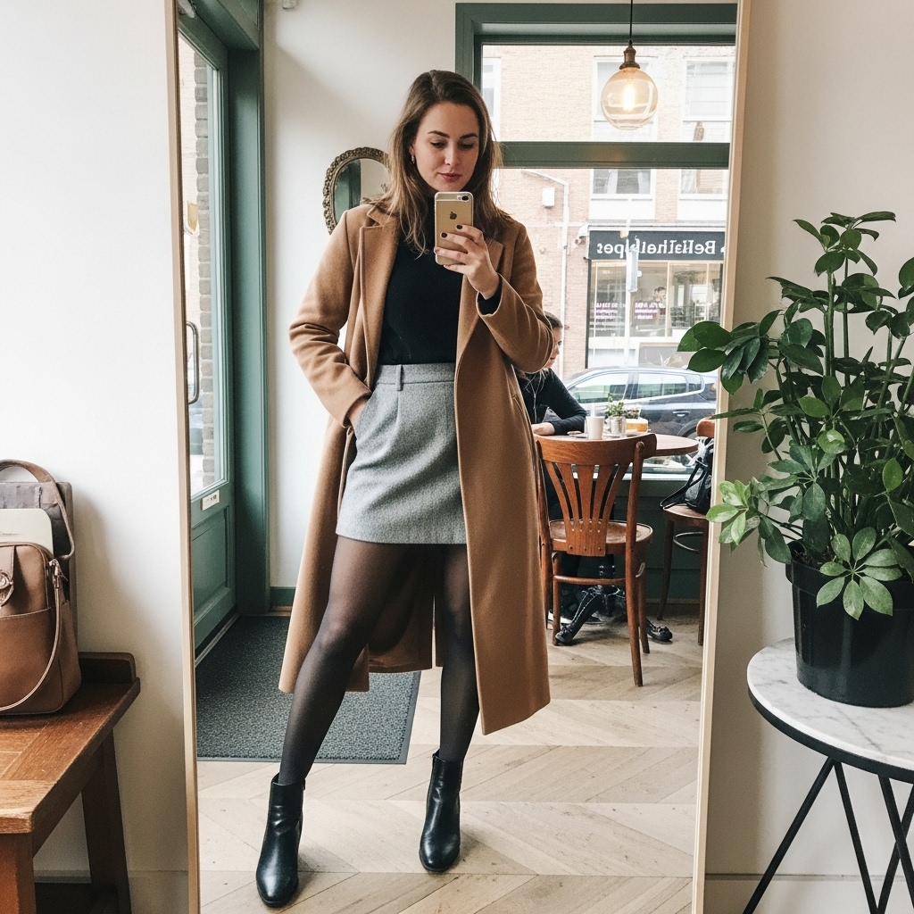 Winter skirts are totally doable with the right layers! Pair a wool mini skirt with opaque tights and a longline coat. Add ankle boots and a turtleneck for cozy sophistication. This feminine and chic outfit works beautifully for brunch or date nights while keeping you comfortably warm.