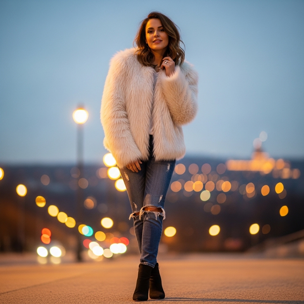 A faux fur jacket adds instant glam to any winter outfit. Wear it over a simple tee and distressed jeans for a stylish mix of luxe and casual. Add heeled boots and a clutch bag to complete the look. Perfect for evening outings, this look radiates confidence and cozy luxury.