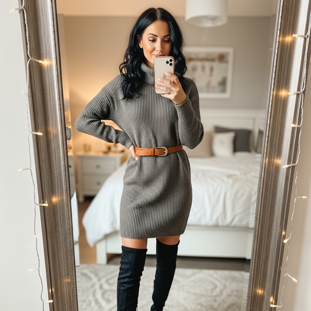 Effortless and chic, a turtleneck sweater dress is a winter must-have. Pair it with over-the-knee boots for warmth and style. Accessorize with a statement belt to define your waist. This outfit transitions easily from day to night and keeps you comfortable without sacrificing elegance.