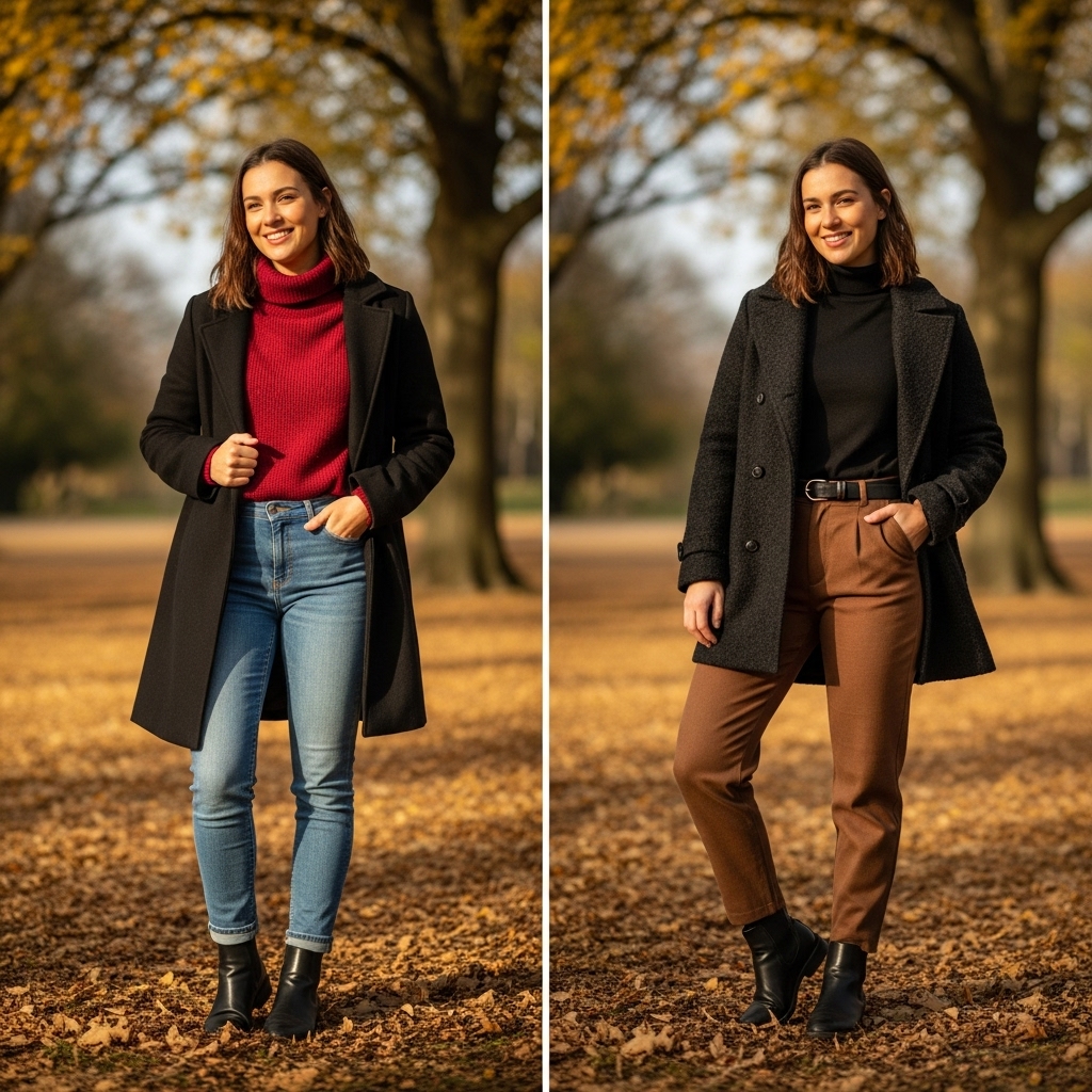 Turn heads this winter with a bold statement coat over an all-black outfit. Whether it’s red, plaid, or textured wool, it becomes the centerpiece. Pair with black trousers and heeled boots for balance. This combination is perfect for expressing your style without overdoing it — simple yet striking.