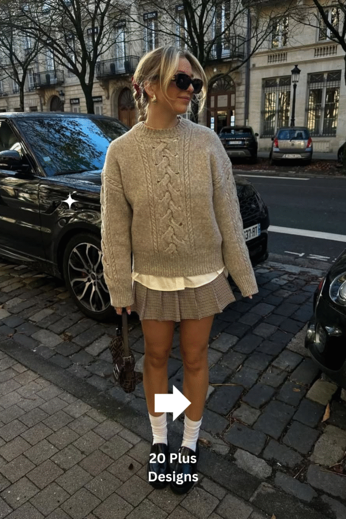 1. Cable Knit Sweater with Layered Shirt & Plaid Mini Skirt