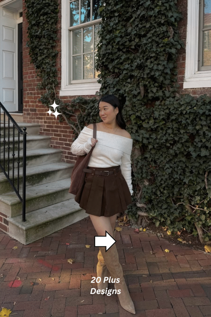 A soft off-shoulder cream sweater paired with a brown pleated skirt creates a dreamy, feminine look that feels effortlessly romantic. The beige suede boots enhance the cozy aesthetic, grounding the outfit while keeping it refined. Perfect for casual winter lunches or cozy evening plans, it’s a warm embrace of comfort and style.