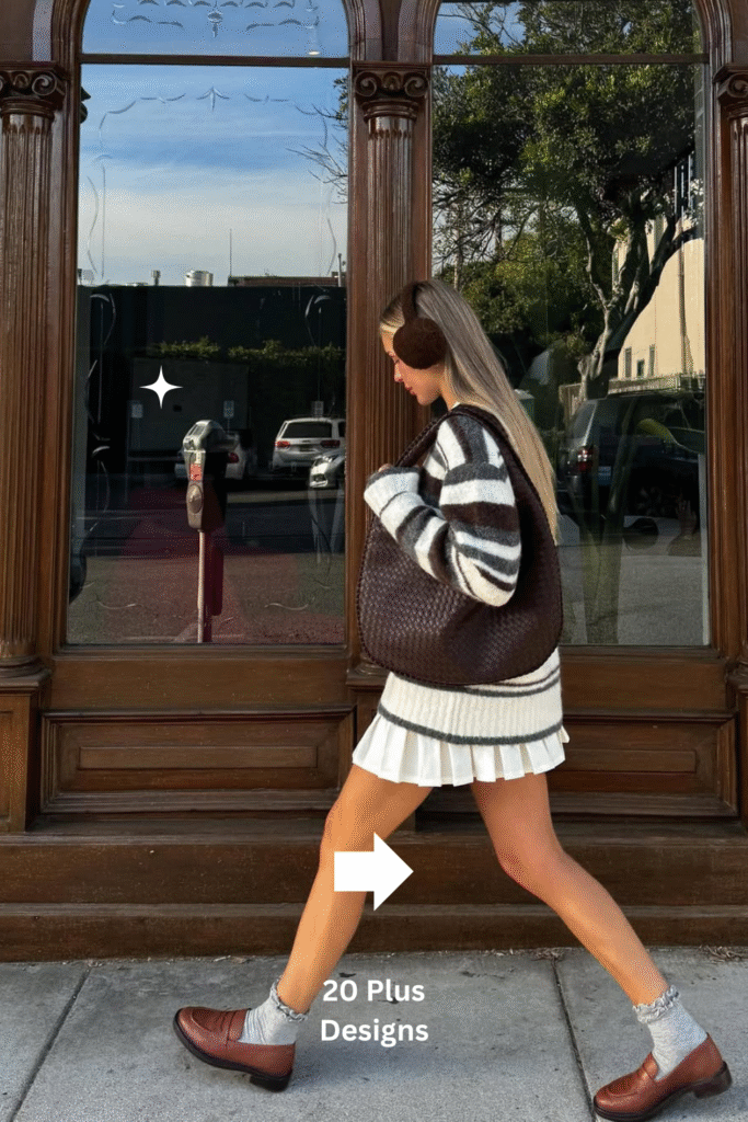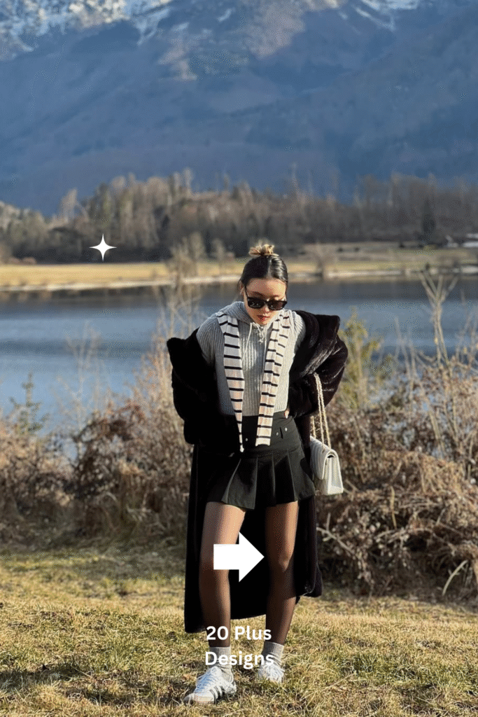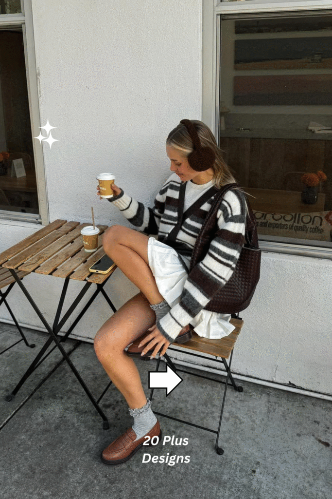 A brown and white striped sweater with a white pleated skirt feels crisp, fresh, and full of cozy charm. The color palette brightens winter’s gloom while keeping the outfit refined and easy to wear. Ideal for daytime outings or brunch dates, it’s a minimalist yet feminine combination that feels both warm and polished.