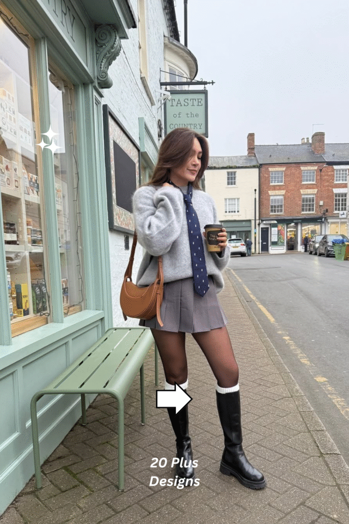 Monochrome lovers will adore this sleek grey-on-grey outfit. The oversized sweater pairs beautifully with the pleated skirt for a cozy yet structured feel, while the black knee-high boots lend a touch of edge. This look works wonderfully for casual city days or cozy winter afternoons, embracing texture and tone in a subtly chic way.