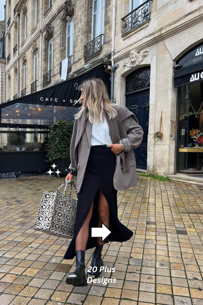 Refined and effortlessly modern, this outfit pairs a taupe oversized blazer with a white top and black slit maxi skirt for an elevated city look. The sleek lines of the skirt contrast with the relaxed fit of the blazer, creating a powerful yet feminine outfit. Perfect for a workday or evening dinner, it’s minimalism at its most sophisticated.