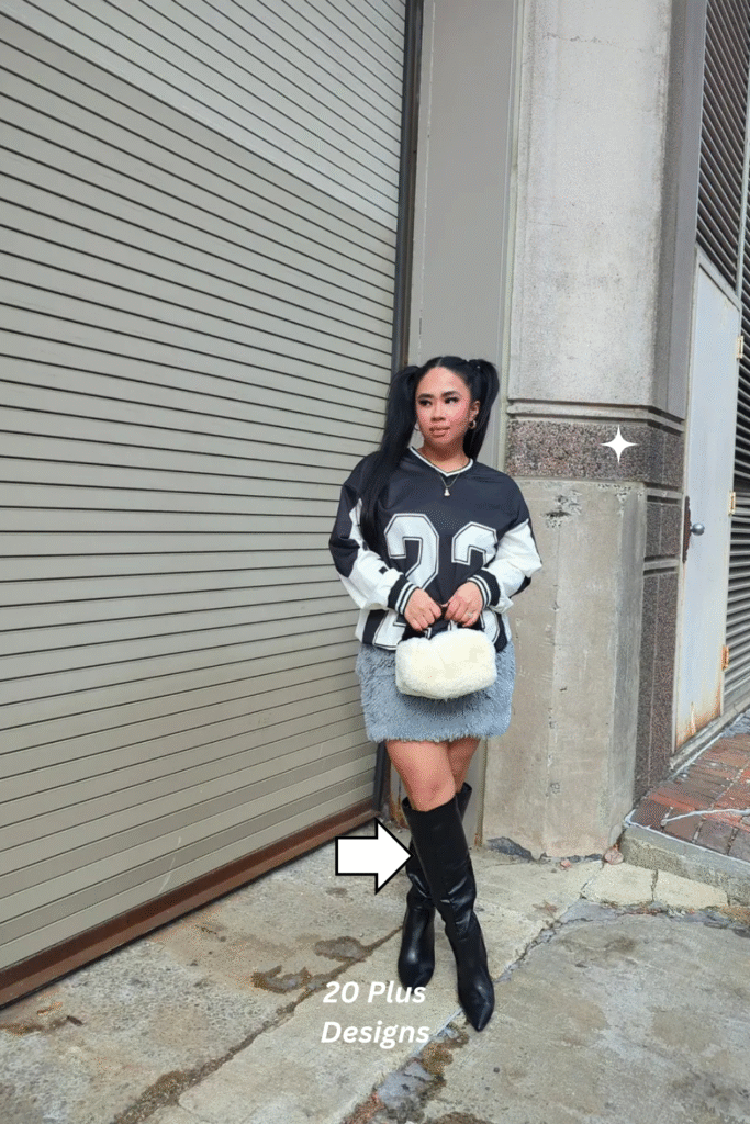 Sporty meets chic in this playful winter combo. The black and white varsity sweater adds a youthful twist, while the fuzzy grey skirt keeps it cozy and fashion-forward. Paired with knee-high boots, it’s a fun yet stylish outfit that’s perfect for everyday wear — a fresh take on winter street style.