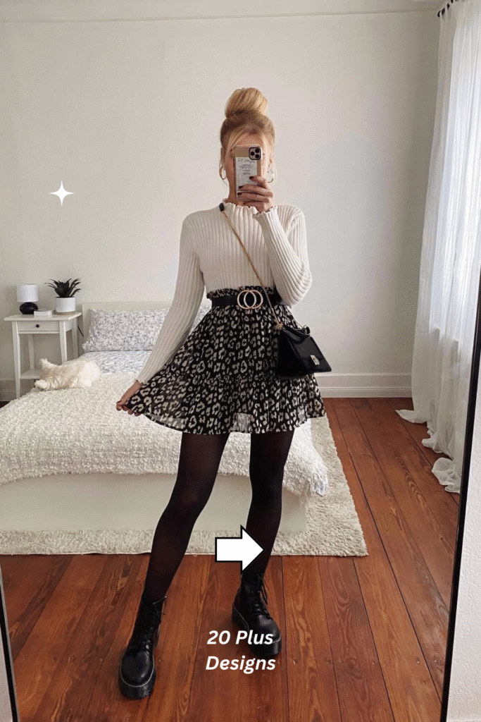 This outfit embraces contrast and confidence. The cream ribbed sweater softens the boldness of the leopard print skirt, while black combat boots add an edgy finish. It’s the ideal choice for fashion lovers who like mixing feminine details with street-style strength, making every winter day feel bold and empowering.