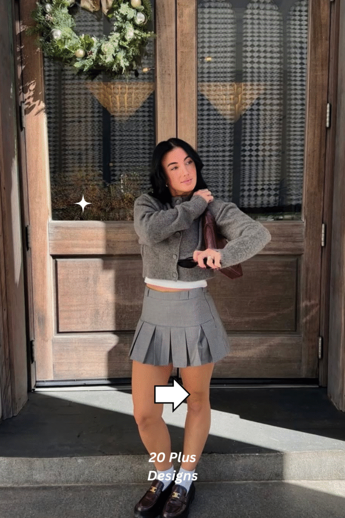 A cropped cardigan layered over a white tank and styled with a pleated grey mini skirt gives off cozy collegiate vibes. The combination feels effortless and cute, while still offering layering potential for cold days. Perfect for relaxed weekends or study sessions at a favorite café, it’s equal parts practical and pretty.