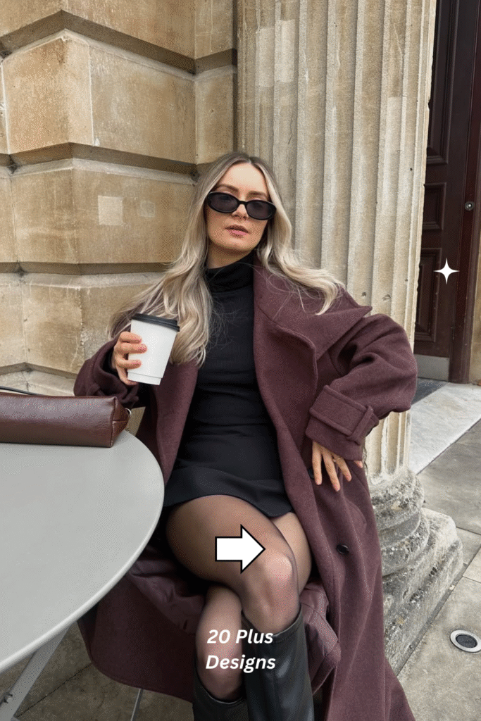 This ensemble oozes sophistication. The deep burgundy wool coat adds rich color and warmth, while the black turtleneck dress and boots keep it sleek and refined. Ideal for workdays, dinners, or winter gatherings, it’s a classic combination that never fails to impress — luxurious, timeless, and effortlessly put-together.
