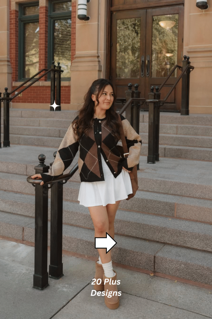 End on a preppy, nostalgic note with this argyle knit cardigan and white pleated mini skirt combo. The retro pattern adds visual charm, while the skirt keeps the look light and playful. Perfect for a crisp winter day out, it’s a stylish nod to vintage fashion that still feels modern and cozy.