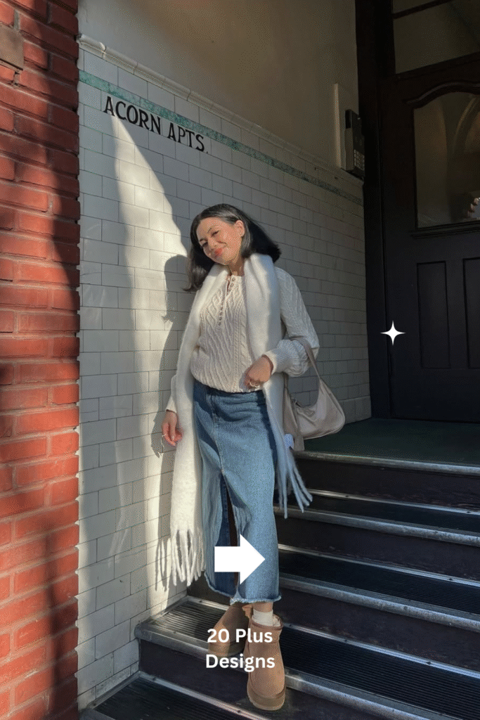 A cozy cable knit sweater paired with split-hem jeans and a soft scarf offers the perfect blend of casual comfort and refined texture. While not skirt-focused, the relaxed silhouette complements colder days when you crave coziness with style. The scarf adds a layer of warmth and softness, creating an ensemble ideal for relaxed weekends or winter travel days in the city.