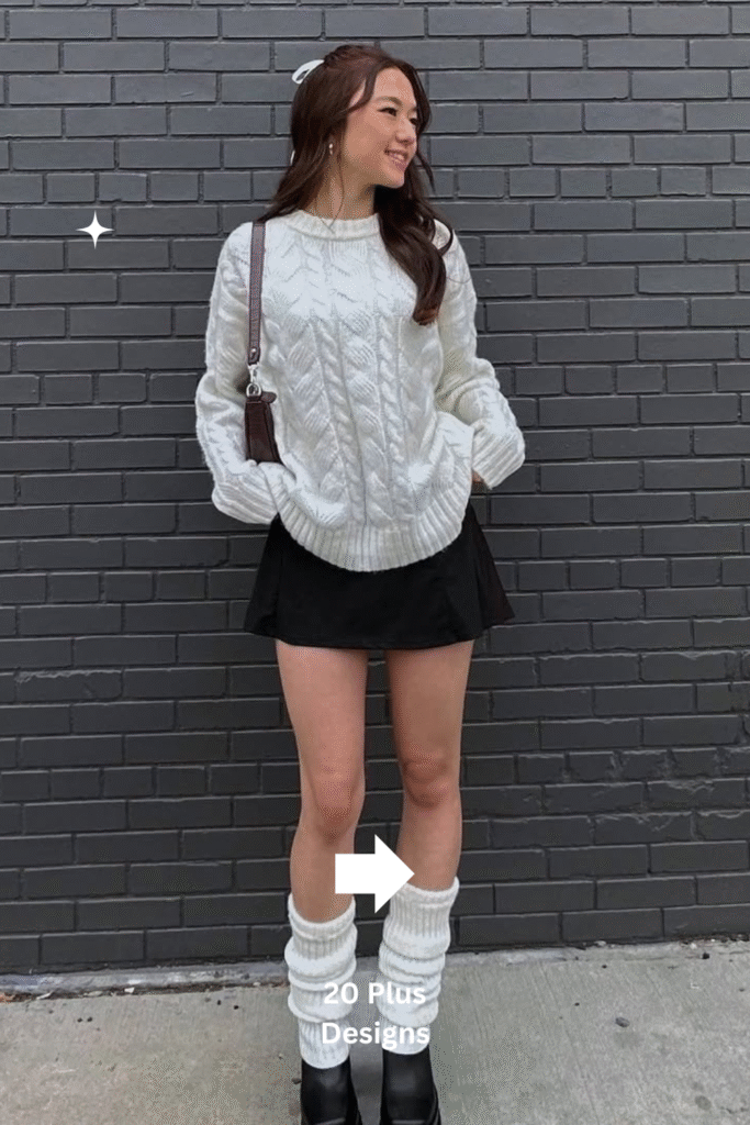 A chunky knit sweater and mini skirt combo brings playful nostalgia to winter fashion, especially when paired with leg warmers. The look feels effortlessly retro yet perfectly current. It’s a cozy, layered outfit that works beautifully for casual outings, festive gatherings, or laid-back winter weekends. The leg warmers not only add warmth but also give the outfit an irresistibly cute, seasonal touch.