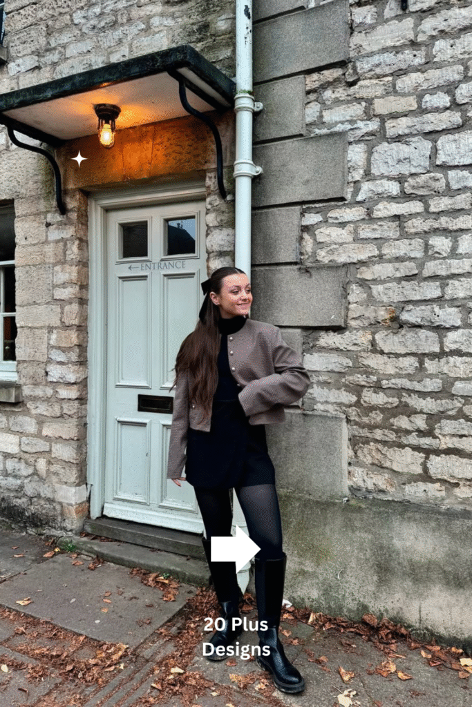 A turtleneck mini dress layered under a cropped jacket and paired with knee-high boots delivers instant winter chic. The silhouette is sleek yet cozy, making it ideal for both day and night. Whether you’re out for dinner or exploring city streets, this outfit radiates confidence and sophistication. The mix of textures keeps it balanced — structured outerwear meets soft knits in true cold-weather harmony.