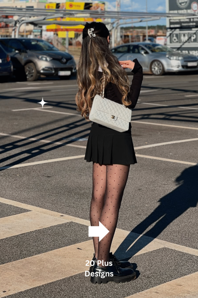 An all-black pleated skirt paired with sheer polka dot tights delivers a bold yet sophisticated statement. The monochrome aesthetic gives it versatility — perfect for evenings out or stylish city strolls. The subtle pattern of the tights adds intrigue without overpowering the outfit, creating a look that’s both refined and flirty.