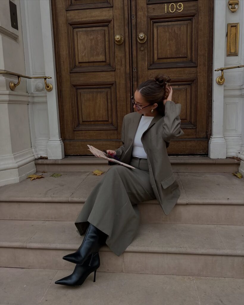 An olive tailored suit instantly elevates your professional wardrobe with its rich tone and contemporary edge. Paired with sleek stiletto ankle boots, the outfit creates a streamlined silhouette that’s ideal for corporate settings, important meetings, or days when you want your presence to feel strong and intentional. The tailoring ensures comfort and mobility, while the boots add just the right amount of sharpness. It’s a striking yet wearable choice for the modern workplace.