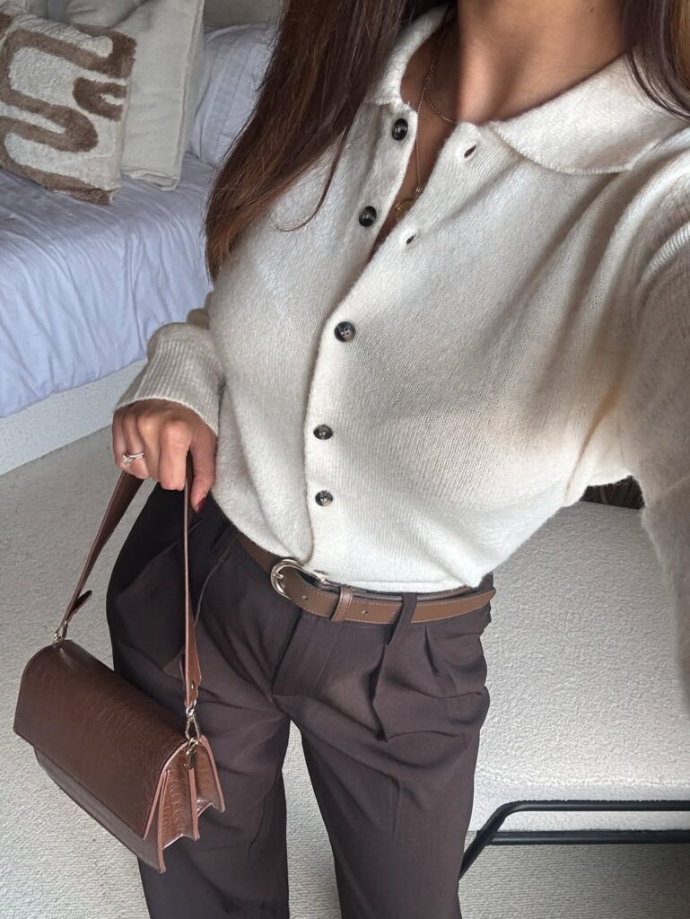 17. Cream Knit Cardigan with Tailored Chocolate Trousers